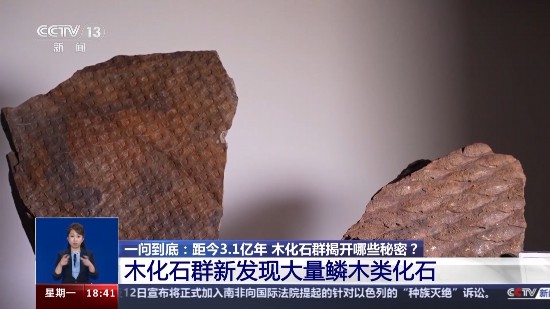 總臺記者崔肖冉:這兩塊就是剛從發掘現場采集的鱗木化石,用手摸一下,一片挨著一片,凹凸不平。我們還發現一個非常有趣的現象,它們的排列方式各不相同,一個是豎著的,而另一個是橫著的。