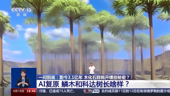 總臺記者崔肖冉:我現在穿越到了3.1億年前的一棵科達木前。這是樹干最粗的地方,大概是我腰圍的4倍,而它的高度竟然達到43.5米,是我身高的25倍。