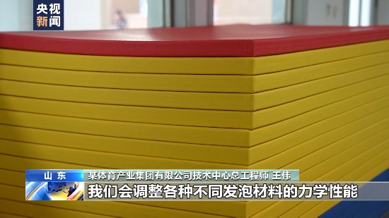 某體育產業集團有限公司技術中心總工程師 王偉:我手里拿的是摔跤墊,這一款是柔道墊,根據項目的不同,我們會調整各種不同發泡材料的力學性能。比如發泡的倍率、密度、硬度以及孔徑的大小、壓縮的彈性性能。首次推出了智能芯片的技術,可以實時采集運動員在運動過程中的力量、速度以及區域信息,以便于給運動員一個訓練指導。我們在皮革的涂層上加了一層納米抗菌涂層膜,它能保證當墊子表面具有微生物的時候,不容易發生積聚和繁衍。這項技術是我們首次應用到柔道墊的產品上。