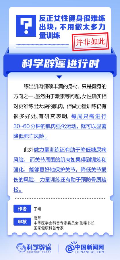 雖然由于激素等問題,女性確實相對更難練出大塊的肌肉,但做力量訓練仍有很多好處。研究表明,每周只需進行30~60分鐘的肌肉強化運動,就可以顯著降低死亡風險。此外,做力量訓練還有助于降低糖尿病風險,關節周圍的肌肉如果得到鍛煉和強化,能夠更好地保護關節,降低關節損傷的風險。