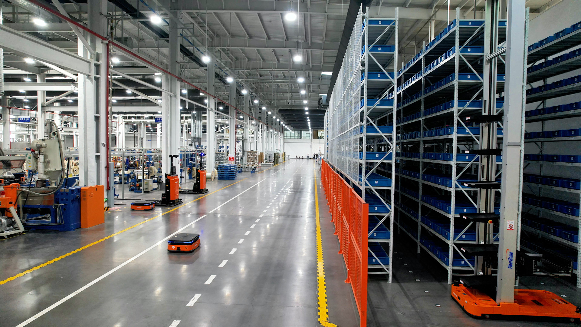 在烽火通信的數字工廠內,生產熱火朝天,卻少見人影。取而代之的AGV機器人在廠內靈活穿梭,十余條高水平自動化生產線開足馬力。