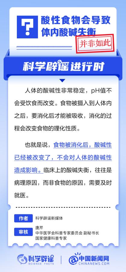 人體的酸堿性非常穩定,pH值不會受飲食而改變。食物被攝入到人體內之后,要消化后才能被吸收,消化的過程會改變食物的理化性質。也就是說,食物被消化后,酸堿性已經被改變了,不會對人體的酸堿性造成影響。臨床上的酸堿失衡,往往是病理原因,而非食物的原因,需要及時就醫。