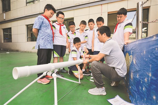 9月30日,在湖南省長沙市天心區沙湖橋小學,學生們在老師的指導下體驗“酒精火箭”的制作。