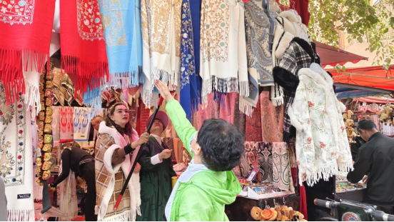 隨著景區影響力持續提升,游客體驗感更加豐富。古老的建筑、濃郁的民俗風情吸引著174家旅拍店遍布各個街巷,并迅速成為游客們爭相體驗的熱門項目,家家店鋪顧客盈門,扶搖攝影店內500余套精美服飾供游客挑選,化妝師正在為河南游客張云云精心準備妝造。無論是漫步在古色古香的街道上,還是穿梭在熱鬧的巴扎中,都能看到游客旅拍的身影。