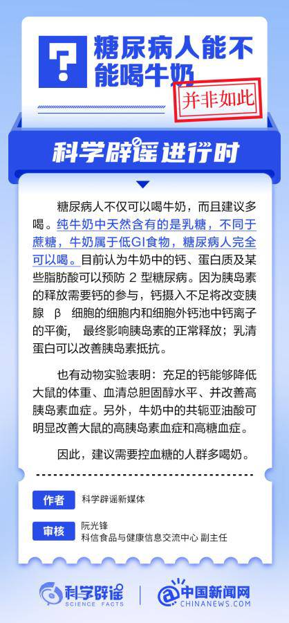 純牛奶中天然含有的是乳糖,不同于蔗糖,牛奶屬于低GI食物,糖尿病人完全可以喝。目前認為牛奶中的鈣、蛋白質及某些脂肪酸可以預防2型糖尿病。因為胰島素的釋放需要鈣的參與,鈣攝入不足將改變胰腺β細胞的細胞內和細胞外鈣池中鈣離子的平衡, 最終影響胰島素的正常釋放;乳清蛋白可以改善胰島素抵抗。