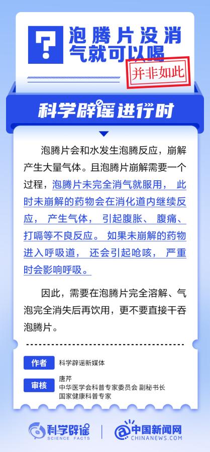 泡騰片會和水發生泡騰反應,崩解產生大量氣體。泡騰片崩解需要一個過程,泡騰片未完全消氣就服用,未崩解的藥物會在消化道內繼續反應,產生氣體,引起腹脹、腹痛、打嗝等不良反應。如果未崩解的藥物進入呼吸道,還會引起嗆咳,嚴重時會影響呼吸。