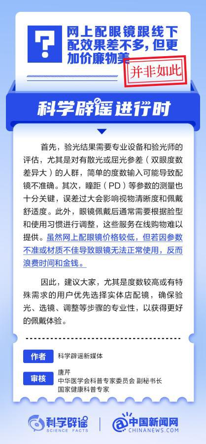 網上配眼鏡比線下更加價廉物美?首先,驗光結果需要專業設備和驗光師的評估,尤其是對有散光或屈光參差(雙眼度數差異大)的人群,簡單的度數輸入可能導致配鏡不準確。其次,瞳距(PD)等參數的測量也十分關鍵,誤差過大會影響視物清晰度和佩戴舒適度。此外,眼鏡佩戴后通常需要根據臉型和使用習慣進行調整,這些服務在線購物難以提供。雖然網上配眼鏡價格較低,但若因參數不準或材質不佳導致眼鏡無法正常使用,反而浪費時間和金錢。(來源:@科學辟謠 中國新聞網微博)