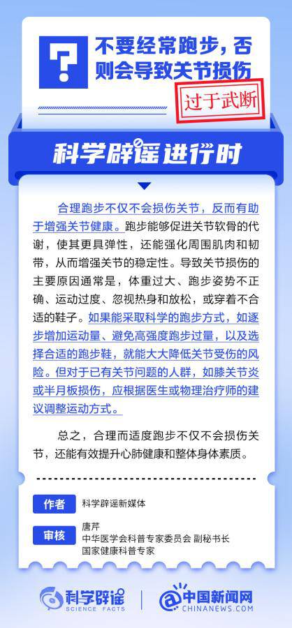 中新網11月12日電 經常跑步一定會損傷關節嗎?合理跑步不僅不會損傷關節,反而有助于增強關節健康。跑步能夠促進關節軟骨的代謝,使其更具彈性,還能強化周圍肌肉和韌帶,從而增強關節的穩定性。導致關節損傷的原因通常是,體重過大、跑步姿勢不正確、運動過度、忽視熱身和放松,或穿著不合適的鞋子。如果能采取科學的跑步方式,如逐步增加運動量、避免高強度跑步過量,選擇合適的跑步鞋,就能大大降低關節受傷的風險。(來源:@科學辟謠 中國新聞網微博 )
