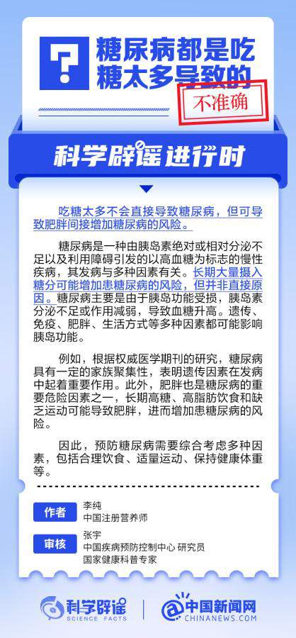 吃糖太多不會直接導致糖尿病,但可導致肥胖間接增加糖尿病的風險。糖尿病主要是由于胰島功能受損,胰島素分泌不足或作用減弱,導致血糖升高。遺傳、免疫、肥胖、生活方式等多種因素都可能影響胰島功能。