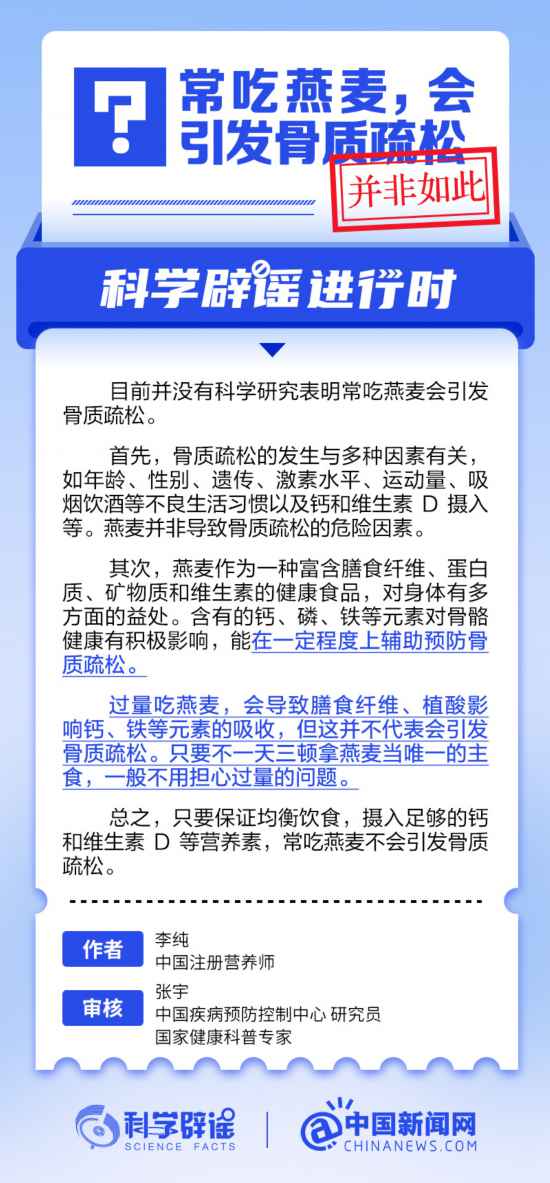 中新網11月18日電 目前并沒有科學研究表明常吃燕麥會引發骨質疏松。過量吃燕麥,會導致膳食纖維、植酸影響鈣、鐵等元素的吸收,但這并不代表會引發骨質疏松。只要不一天三頓拿燕麥當唯一的主食,一般不用擔心過量的問題。(來源:@科學辟謠 @中國新聞網 )