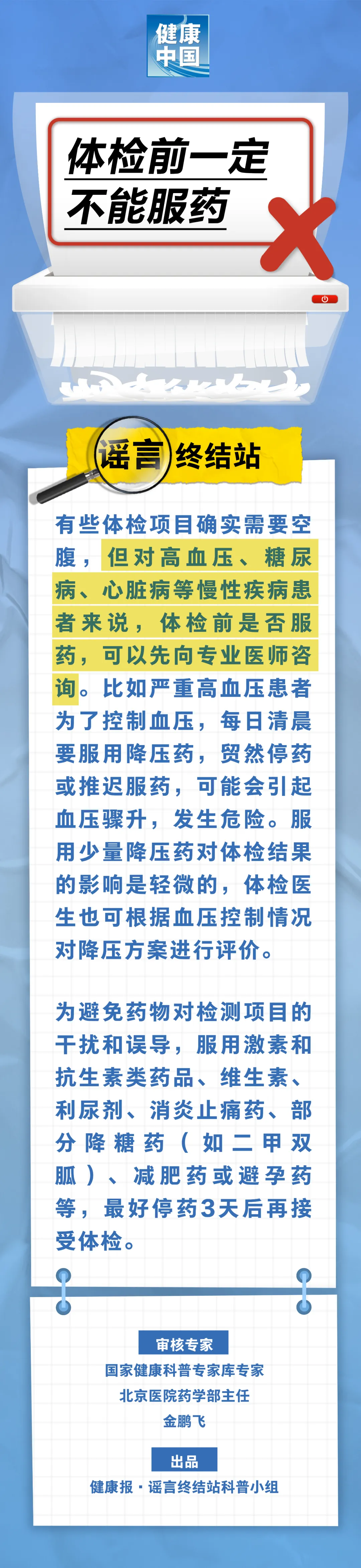 體檢前是否服藥要根據服用的藥物和檢查目的而定。比如,降壓藥可以按照正常服藥時間服完后再進行體檢,避免造成血壓波動過大,還可同時評估降壓藥物的治療效果;而有些需要隨餐服用的降糖藥則不應空腹服用,一般建議隨身攜帶降糖藥,待完成空腹項目后進餐時服用,這樣既保證了服藥效果,又檢測了真實的空腹血糖。