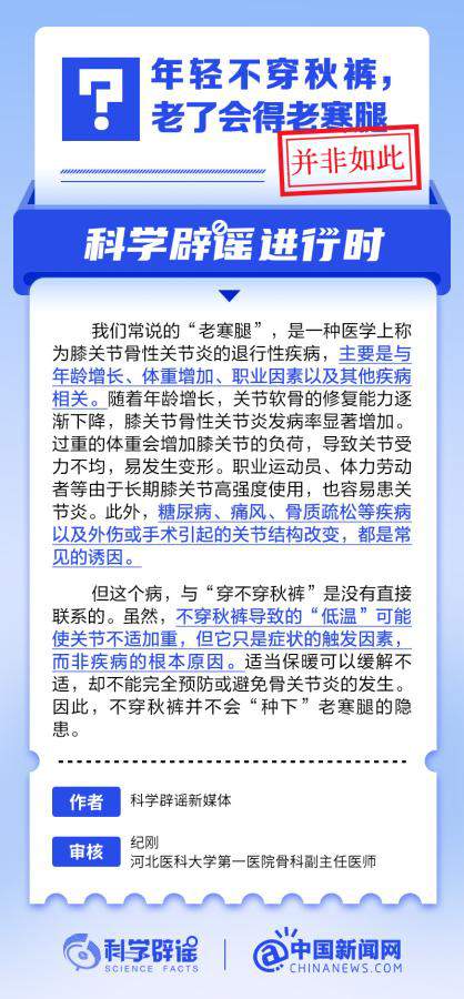 我們常說的“老寒腿”,是一種醫學上稱為膝關節骨性關節炎的退行性疾病,主要是與年齡增長、體重增加、職業因素以及其他疾病相關。隨著年齡增長,關節軟骨的修復能力逐漸下降,膝關節骨性關節炎發病率顯著增加。這個病與“穿不穿秋褲”是沒有直接聯系的。
