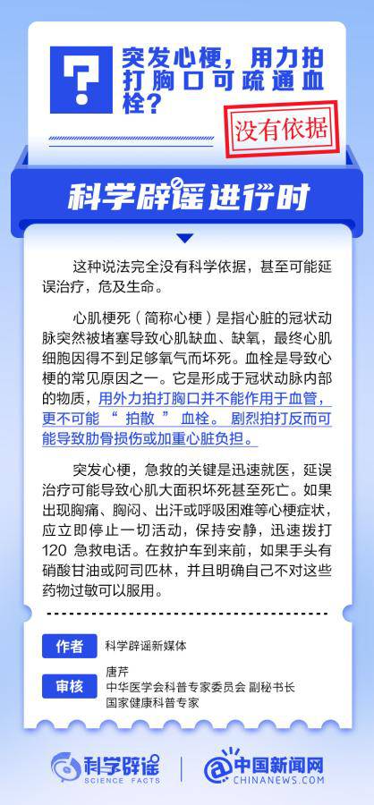 心肌梗死(簡稱心梗)是指心臟的冠狀動脈突然被堵塞導致心肌缺血、缺氧,最終心肌細胞因得不到足夠氧氣而壞死。血栓是導致心梗的常見原因之一。它是形成于冠狀動脈內部的物質,用外力拍打胸口并不能作用于血管,更不可能“拍散”血栓。劇烈拍打胸口反而可能導致肋骨損傷或加重心臟負擔。