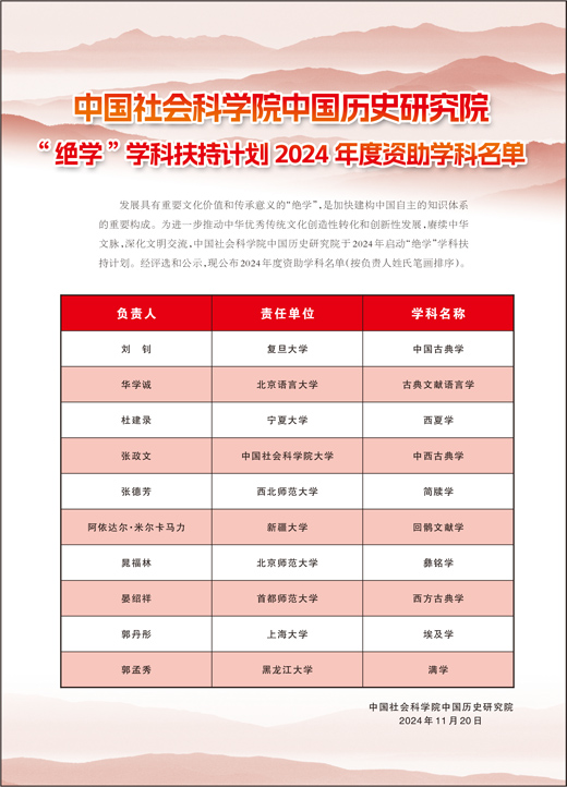 中國社會科學院中國歷史研究院 “絕學”學科扶持計劃2024年度資助學科名單