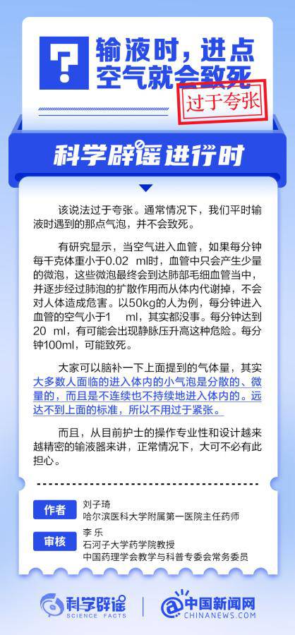 有研究顯示,當空氣進入血管,如果每分鐘每千克體重小于0.02ml時,血管中只會產生少量的微泡,這些微泡最終會到達肺部毛細血管當中,并逐步經過肺泡的擴散作用而從體內代謝掉,不會對人體造成危害。以50kg的人為例,每分鐘進入血管的空氣小于1ml,其實都沒事。每分鐘達到20ml,有可能會出現靜脈壓升高這種危險。每分鐘100ml,則可能致死。