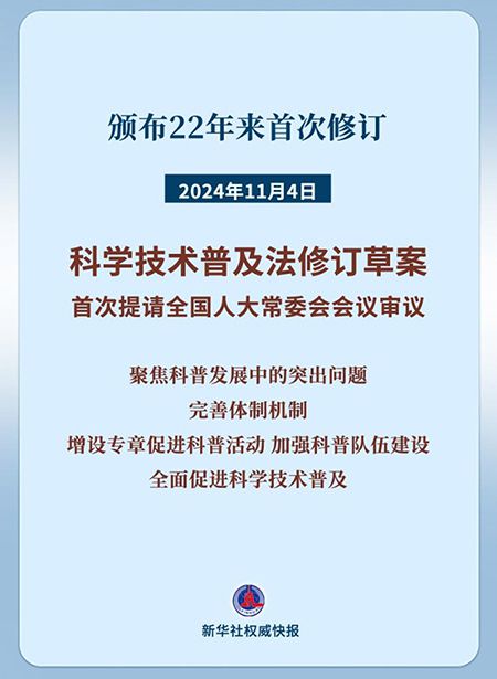 11月4日,科學技術普及法修訂草案首次提請全國人大常委會會議審議,這是科學技術普及法自2002年公布施行以來的首次修訂。