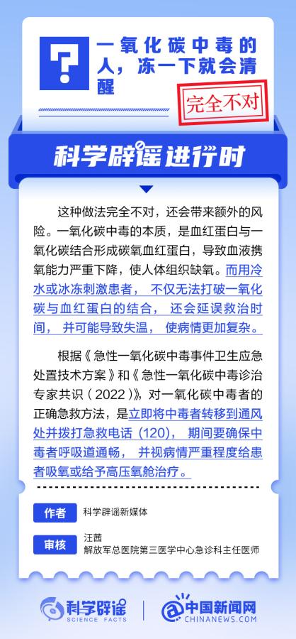 一氧化碳中毒的本質,是血紅蛋白與一氧化碳結合形成碳氧血紅蛋白,導致血液攜氧能力嚴重下降,使人體組織缺氧。而用冷水或冰凍刺激中毒患者,不僅無法打破一氧化碳與血紅蛋白的結合,還會延誤救治時間,并可能導致失溫,使病情更加復雜。