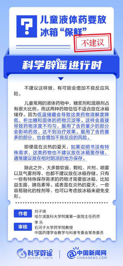 兒童常用的液體藥物中,糖漿劑和混懸劑占有很大比例。而這兩種藥物恰恰不適合放在冰箱儲存。低溫儲藏會導致這類藥物溶解度降低,析出糖和固體的藥物沉淀等。這樣會直接導致藥物濃度不均勻,服用了含藥量少的部分會影響藥效,達不到治療效果。服用了含藥量多的部分,也會增加不良反應的風險。只有一些有特殊保存需求的藥物才需要放冰箱。