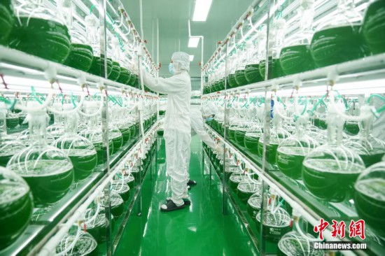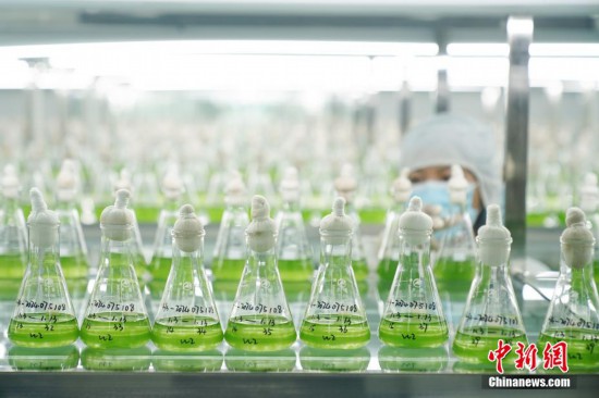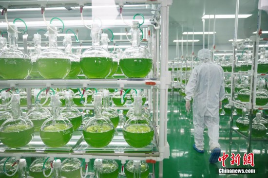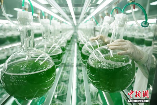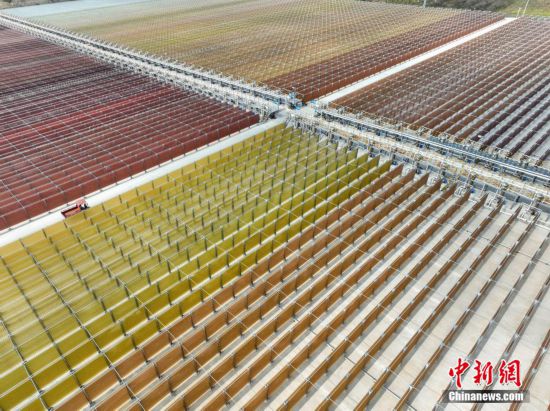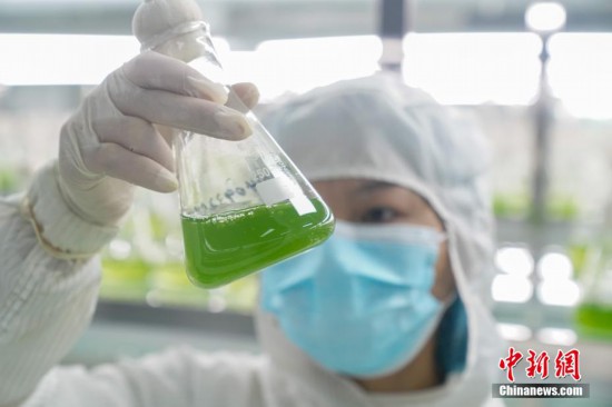 1月23日,工作人員進行室內擴種工作。位于中國西南邊陲的云南省紅河州屏邊縣坐落著全球最大天然蝦青素生產基地,該基地占地595.58畝,分兩期建設,目前已部分投產。待全部建成投產后,將實現年產雨生紅球藻粉200噸,蝦青素油65噸,蝦青素微囊粉200噸,預計年產值達12億元人民幣。據了解,雨生紅球藻是目前發現的自然界中蝦青素含量最高的生物。