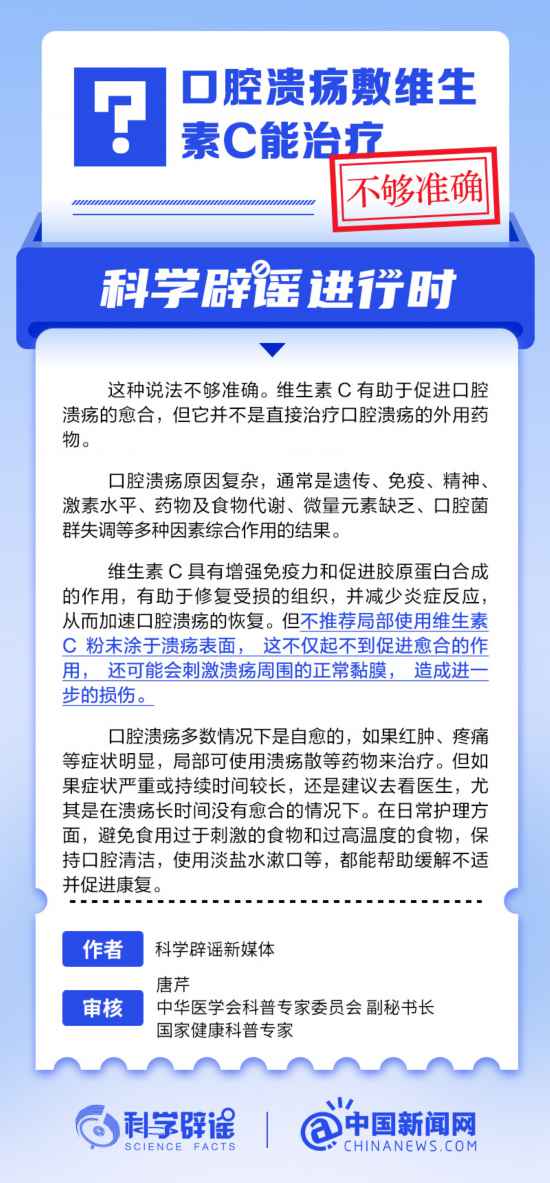維生素C有助于促進口腔潰瘍的愈合,但它并不是直接治療口腔潰瘍的外用藥物。維生素C具有增強免疫力和促進膠原蛋白合成的作用,有助于修復受損的組織,并減少炎癥反應,從而加速口腔潰瘍的恢復。但不推薦局部使用維生素C粉末涂于潰瘍表面,這不僅起不到促進愈合的作用,還可能會刺激潰瘍周圍的正常黏膜,造成進一步的損傷。