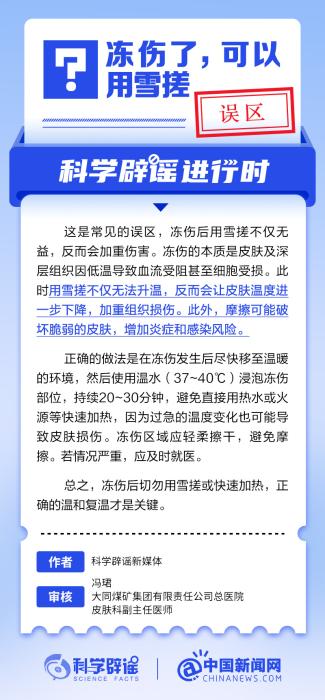 凍傷后用雪搓不僅無益,反而會加重傷害。凍傷的本質是皮膚及深層組織因低溫導致血流受阻甚至細胞受損。此時用雪搓不僅無法升溫,反而會讓皮膚溫度進一步下降,加重組織損傷。此外,摩擦可能破壞脆弱的皮膚,增加炎癥和感染風險。
