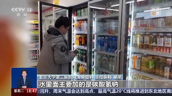 北京大學第三醫院風濕免疫科 主任醫師 穆榮:狹義的蘇打水就是水里面主要加的是碳酸氫鈉,廣義的當然就更多了,包括大家喝的各種可樂、雪碧。