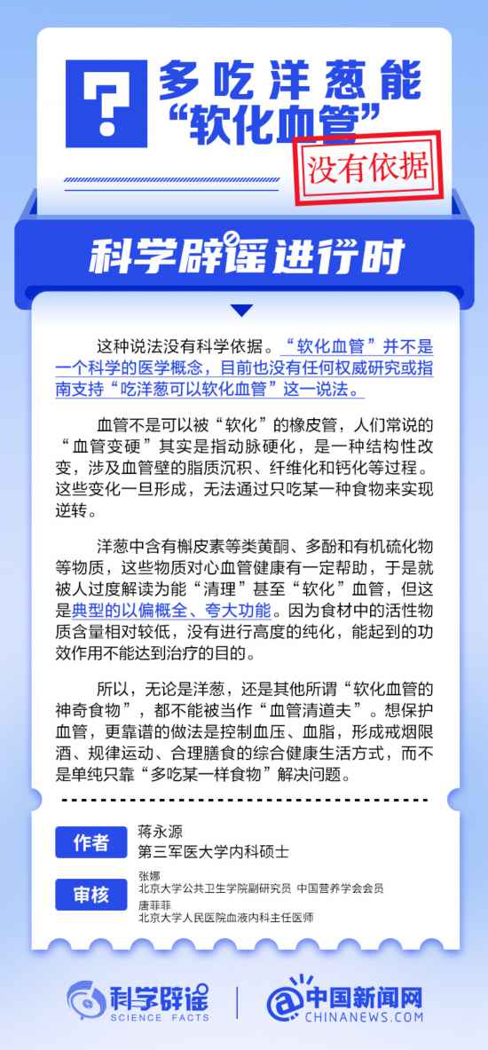 “軟化血管”并不是一個科學的醫學概念,目前也沒有任何權威研究或指南支持“吃洋蔥可以軟化血管”這一說法。人們常說的“血管變硬”其實是指動脈硬化,這是一種結構性改變,涉及血管壁的脂質沉積、纖維化和鈣化等過程。這些變化一旦形成,無法通過只吃某一種食物來實現逆轉。