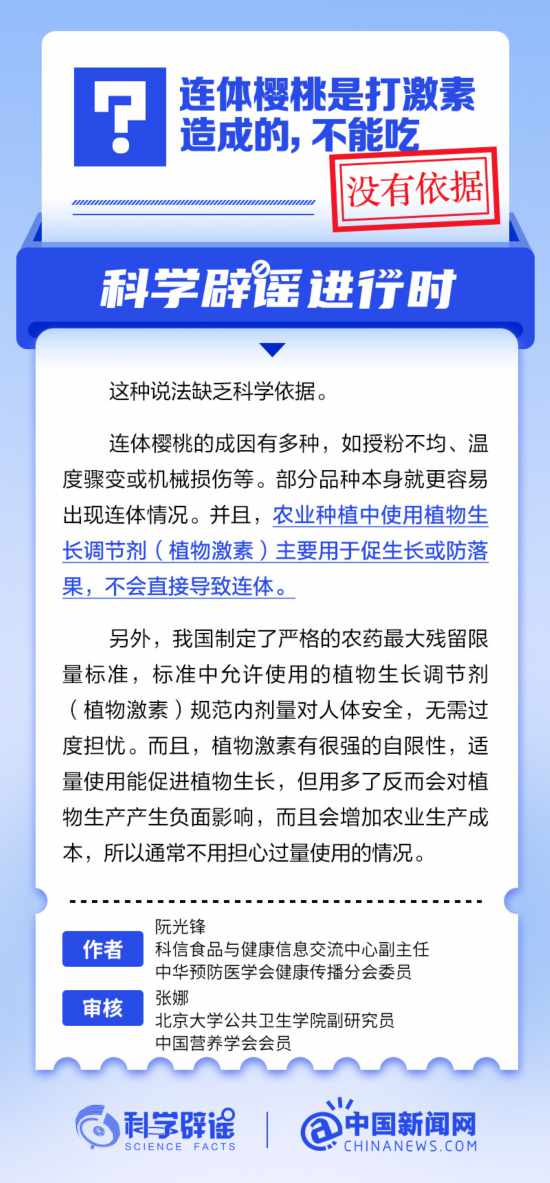 連體櫻桃的成因有多種,如授粉不均、溫度驟變或機械損傷等。農業種植中使用植物生長調節劑(植物激素)主要用于促生長或防落果,不會直接導致連體。另外,我國制定了嚴格的農藥最大殘留限量標準,標準中允許使用的植物生長調節劑(植物激素)規范內劑量對人體安全,無需過度擔憂。