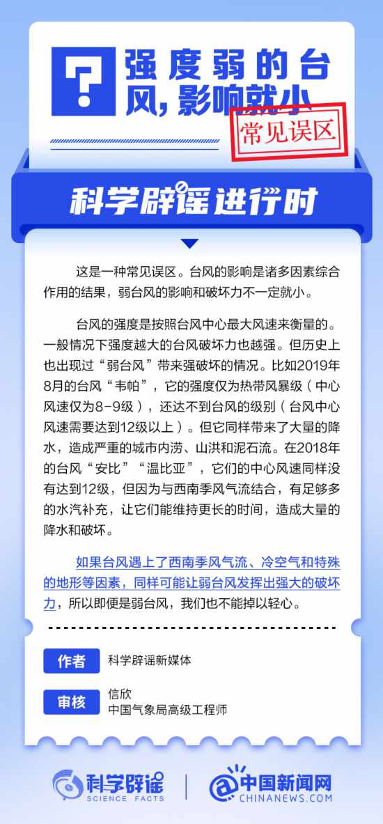 臺風的影響是諸多因素綜合作用的結果,弱臺風的影響和破壞力不一定小。臺風的強度是按照臺風中心最大風速來衡量的。一般情況下強度越大的臺風破壞力也越強。但歷史上也出現過“弱臺風”帶來強破壞的情況。如果臺風遇上了西南季風氣流、冷空氣和特殊的地形等因素,同樣可能讓弱臺風發揮出強大的破壞力,所以即便是弱臺風,我們也不能掉以輕心。