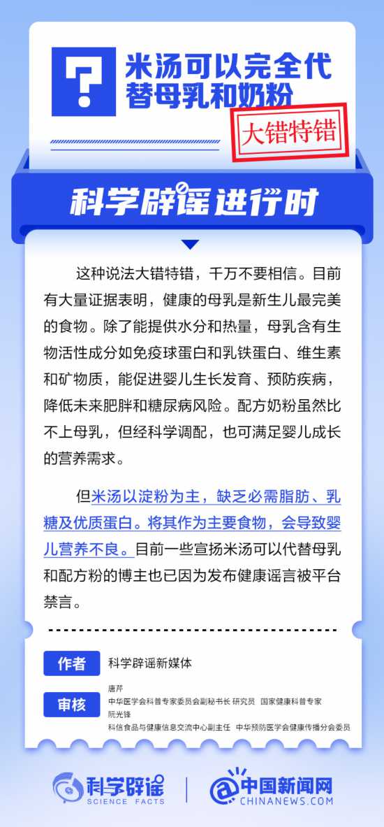 目前有大量證據表明,健康的母乳是新生兒最完美的食物。除了能提供水分和熱量,母乳含有生物活性成分如免疫球蛋白和乳鐵蛋白、維生素和礦物質,能促進嬰兒生長發育、預防疾病,降低未來肥胖和糖尿病風險。配方奶粉雖然比不上母乳,但經科學調配,也可滿足嬰兒成長的營養需求。但米湯以淀粉為主,缺乏必需脂肪、乳糖及優質蛋白,將其作為主要食物,會導致嬰兒營養不良。