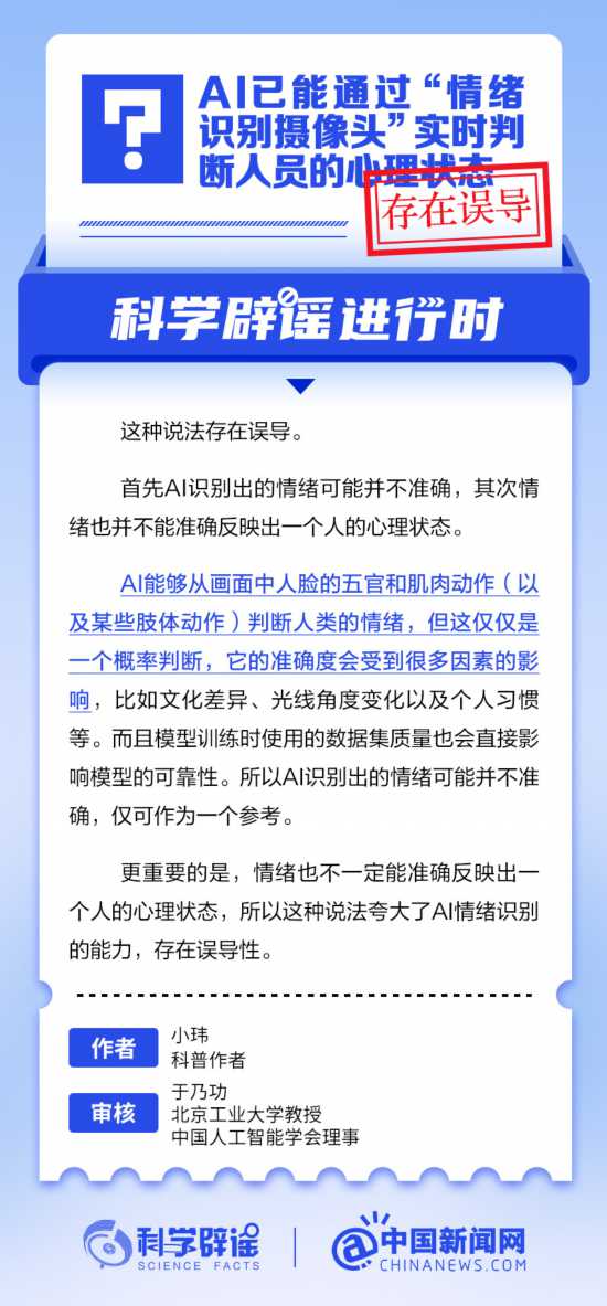 AI能夠從畫面中人臉的五官和肌肉動作(以及某些肢體動作)判斷人類的情緒,但這僅僅是一個概率判斷,它的準確度會受到很多因素的影響,比如文化差異、光線角度變化以及個人習慣等。而且模型訓練時使用的數據集質量也會直接影響模型的可靠性。所以AI識別出的情緒可能并不準確,僅可作為一個參考。