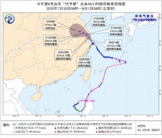 中新網7月30日電 據中央氣象臺網站消息,今天(30日)4:30前后,今年第8號臺風“竹節草”(熱帶風暴級)在浙江省舟山市朱家尖島沿海登陸,登陸時中心附近最大風力有9級(23米/秒)。未來,其將以每小時10~15公里的速度向北偏西方向移動,強度還會有所增強,30日白天將在浙江寧波到江蘇啟東一帶沿海再次登陸(23~28米/秒,9~10級,熱帶風暴級或強熱帶風暴級),登陸后強度緩慢減弱。