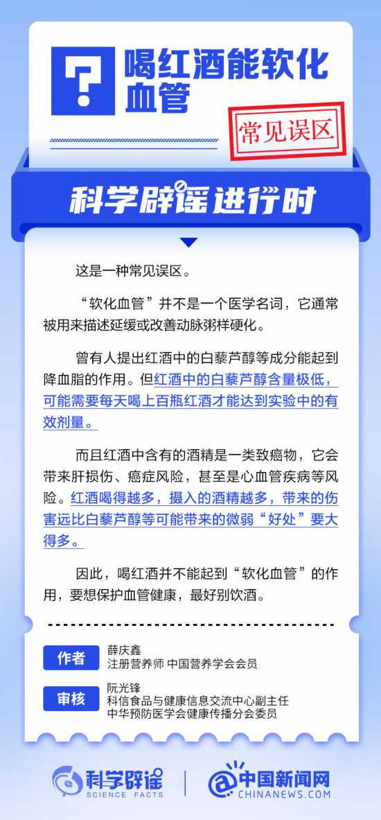 “軟化血管”通常被用來描述延緩或改善動脈粥樣硬化。曾有人提出紅酒中的白藜蘆醇等成分能起到降血脂的作用。但紅酒中的白藜蘆醇含量極低,可能需要每天喝上百瓶紅酒才能達到實驗中的有效劑量。且酒精是一類致癌物,它會帶來肝損傷、癌癥風險,甚至是心血管疾病等風險。攝入的酒精越多,帶來的傷害遠比白藜蘆醇等可能帶來的微弱“好處”要大得多。