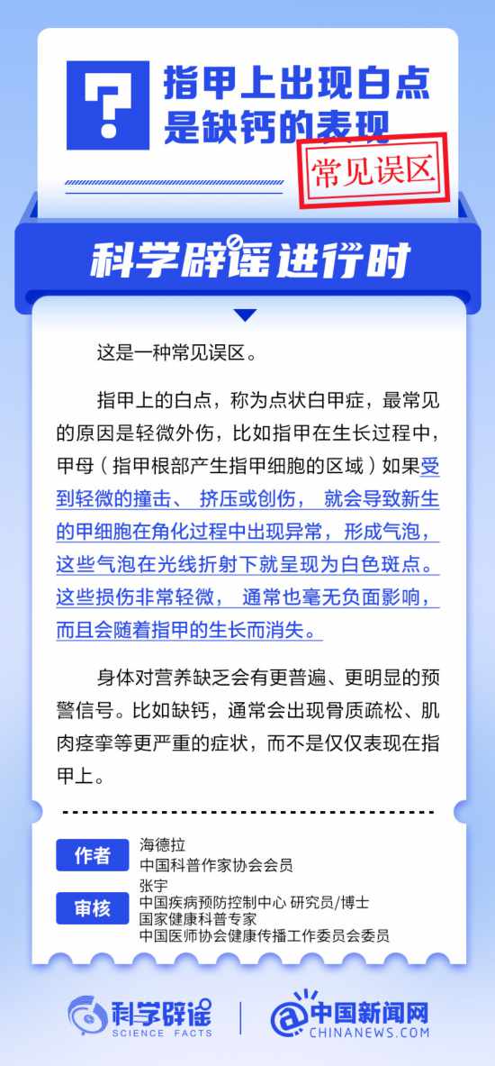 中新網7月31日電 指甲上的白點,稱為點狀白甲癥,其生成最常見的原因是輕微外傷,比如指甲在生長過程中,甲母(指甲根部產生指甲細胞的區域)如果受到輕微的撞擊、擠壓或創傷,就會導致新生的甲細胞在角化過程中出現異常,形成氣泡,這些氣泡在光線折射下就呈現為白色斑點。這些損傷非常輕微,通常也毫無負面影響,而且會隨著指甲的生長而消失。身體對營養缺乏會有更普遍、更明顯的預警信號。比如缺鈣通常會出現骨質疏松、肌肉痙攣等更嚴重的癥狀,而不是僅僅表現在指甲上。