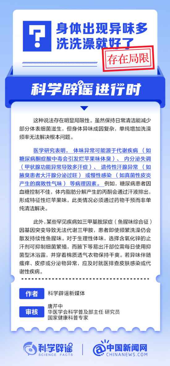 雖然保持日常清潔能減少部分體表細菌滋生,但身體異味成因復雜,單純增加洗澡頻率無法解決根本問題。醫學研究表明,體味異??赡茉从诖x疾病、內分泌失調、遺傳性汗腺異?;蚵愿腥镜炔±硪蛩?。