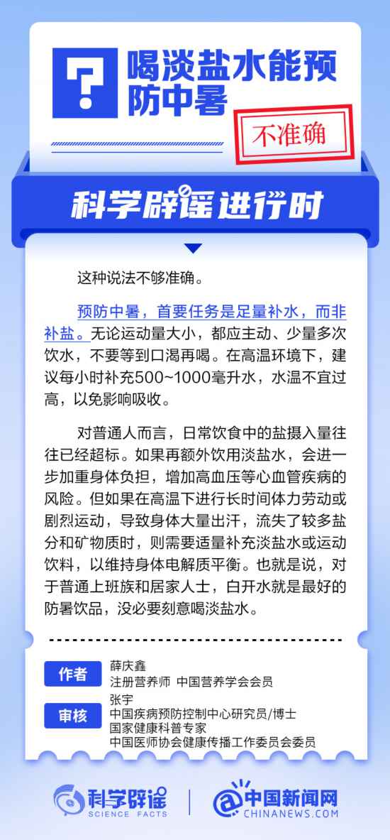預防中暑,首要任務是足量補水,而非補鹽。無論運動量大小,都應主動、少量多次飲水,不要等到口渴再喝。在高溫環境下,建議每小時補充500~1000毫升水,水溫不宜過高。對普通人而言,日常飲食中的鹽攝入量往往已經超標。如果再額外飲用淡鹽水,會進一步加重身體負擔,增加高血壓等心血管疾病的風險。