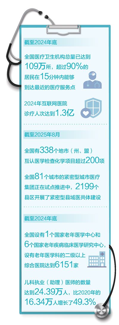 優化醫療衛生資源配置,推動資源和服務更加貼近居民群眾。加強國家醫學中心、國家區域醫療中心和省級區域醫療中心建設,推動優質醫療資源向中西部、東北地區、省域內人口較多的地市和基層延伸和下沉。截至2024年底,全國醫療衛生機構總量已達到109萬所,超過90%的居民在15分鐘內能夠到達最近的醫療服務點。