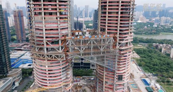 日前,深圳灣超級總部基地C塔項目6000噸鋼結構連廊在119.15米高空完成提升合龍,大灣區連廊雙子塔新地標實現高空毫米級合體。