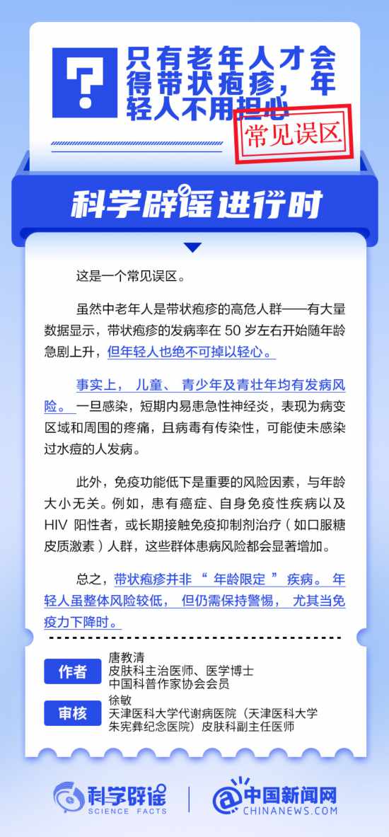 雖然中老年人是帶狀皰疹的高危人群,但年輕人也絕不可掉以輕心,兒童、青少年及青壯年均有發病風險。一旦感染,短期內易患急性神經炎,表現為病變區域和周圍的疼痛,且病毒有傳染性,可能使未感染過水痘的人發病。